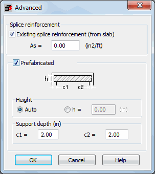 Pressing the Advanced button in the Section definition dialog box results in displaying the dialog box shown above. The options available in the Splice reinforcement field allow one to define the existing reinforcement determined for a slab. The reinforcement area is defined as the are per meter and it will be used in calculations.
