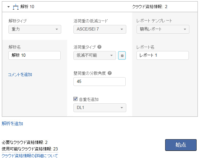 [新しい解析]ページが開きます。このページで、解析のパラメータを定義することができます。既定では、以前に実行された解析のタイプとパラメータが表示されます。