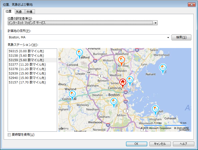 マップ内および左側のリストに使用可能な気象ステーションが表示されます。一般的には、現在地に最も近い気象ステーションを選択します。ただし、標高や風土条件などにおいてモデルの位置をよりよく反映している付近の気象ステーションから選択することもできます。