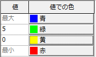 既定では、最大と最小の値 - 色ペアがあります。これらの値は表示されるデータに関連しています。設定が可能なのは、[最小]および[最大]値の色だけです。これらの値 - 色ペアは削除することはできません。