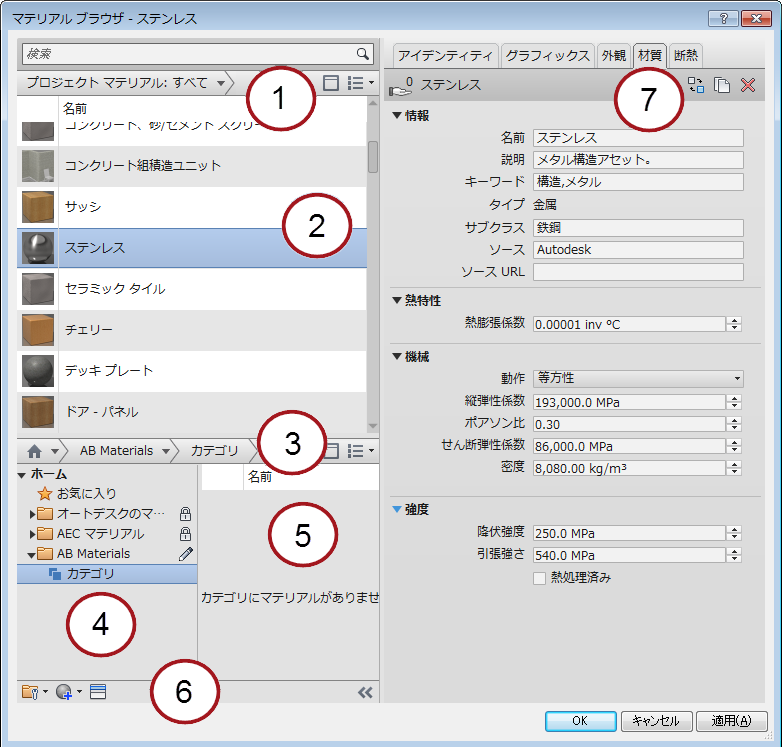7 | ライブラリのリスト(左ペイン)でマテリアルを選択すると、このマテリアルに関連付けられたタブ(アセット)が右ペインに表示されます。マテリアルのプロパティとアセットを表示するには、タブ(たとえば、[識別]または[外観])をクリックします。ライブラリのマテリアルを表示している間、プロパティは読み取り専用になります。 |