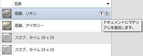 同じ名前の別のマテリアルが存在するライブラリにマテリアルをコピーすると、コピー先のバージョンを上書きするか、両方を保持するかを尋ねるメッセージが表示されます。両方を保持する場合は、コピーしているマテリアルのマテリアル名に番号が付加されます。たとえば、「陶製、象牙色(2)」です。