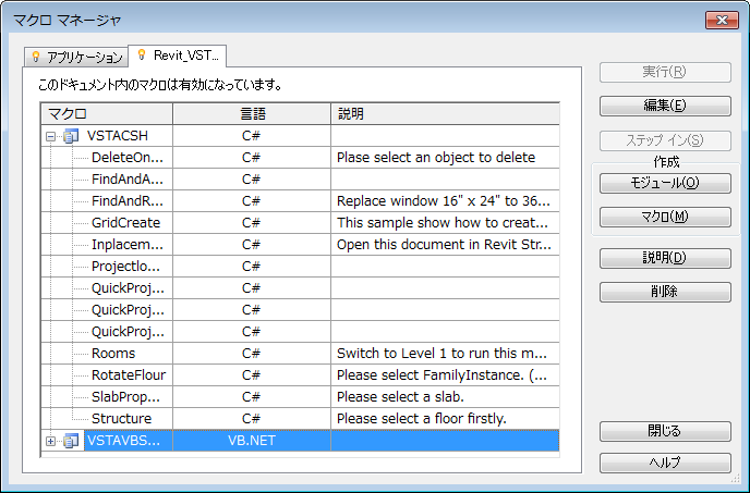 これらのマクロは、Revit で動作するようにあらかじめ構成されています。マクロ マネージャでは、いずれかのサンプル マクロを選択して[編集]をクリックすると、そのサンプルの実行に作成されたコードを表示することもできます。いずれかのサンプル マクロを選択して[編集]をクリックすると、そのサンプルの実行に作成されたコードを表示することもできます。