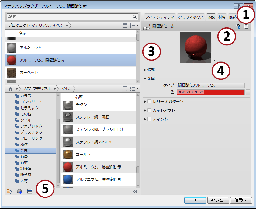 4 | [プロパティ]パネル: 選択したアセットの詳細なプロパティを表示、管理します。アセットの名前と説明は[情報]ドロップダウン パネルの下に表示されます。上の例では、「Anodized - Red」の[外観]アセットで表示(拡張)される[メタル]プロパティを表しています。 |