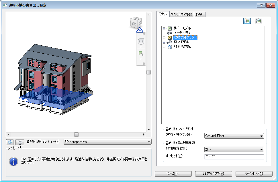 [建物外構の書き出し設定]ダイアログを最初に開いたときは、既定で、アクティブな 3D ビューがプレビュー ペインに表示されます。アクティブなビューが 3D ビューでない場合は、[書き出し用 3D ビュー]リストの最初の 3D ビューが表示されます。[次へ]または[設定を保存]をクリックすると、ダイアログの設定が保存され、次回ダイアログを開くと、同じ設定になります。
