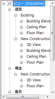 たとえば下の図では、プロジェクト ブラウザの中のビューが、専門分野別、相別、さらにビュー タイプ別に分類されているようすを示しています。ビュー ブランチの最高位には、現在適用されている並べ替えグループの名前(この場合は「専門分野」)も表示されます。