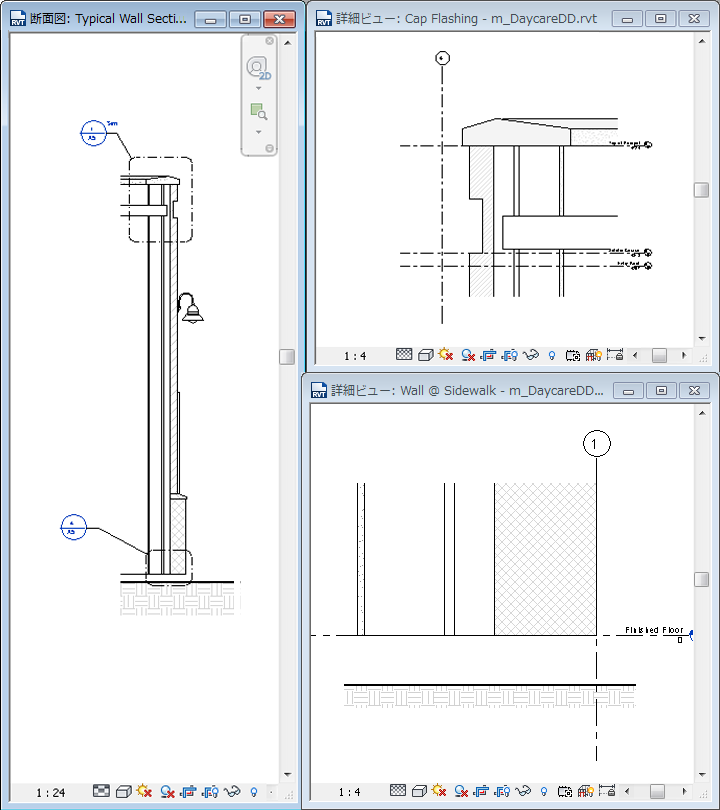 平面図ビュー、断面図ビュー、詳細ビュー、立面図ビューに詳細吹き出しまたは吹き出しビューを追加できます。ビューに吹き出し領域線を描画すると、Revit は、吹き出しビューを作成します。次に、その吹き出しビューに詳細を追加すると、建物モデルのその部分について詳細な情報を提供できます。