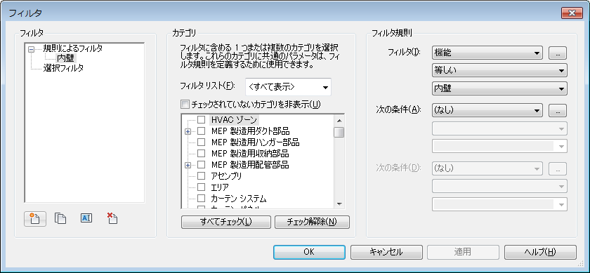 例: 2 時間耐火ドアだけを表示するフィルタを作成するには、[ドア]カテゴリを選択します。2 時間耐火ドアと壁を表示するフィルタを作成するには、[ドア]と[壁]のカテゴリを選択します。