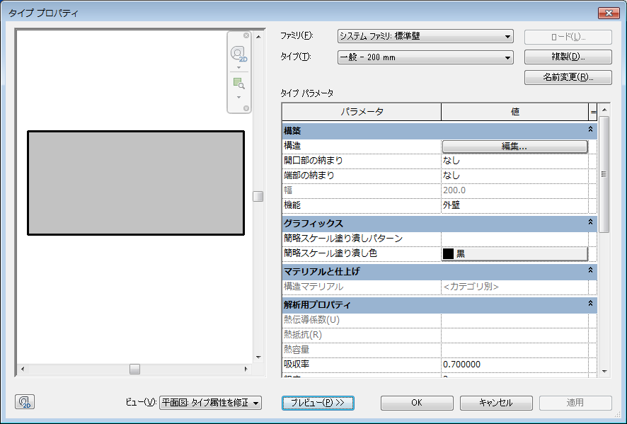 次に示す例は、壁タイプの[タイプ プロパティ]ダイアログで、[プレビュー]ペインが表示されています。