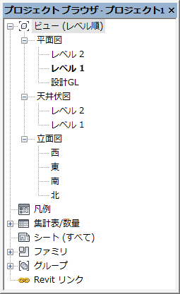 [プロジェクト ブラウザ]では、すべてのビュー、集計表、シート、グループ、現在のプロジェクトのその他のパーツの論理階層が表示されます。各ブランチを展開したり折りたたむと、下のレベル項目が表示されます。