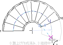 - 前の手順と同じ方法で、中心-両端指定によるらせん階段経路を作成しますが、踊り場を設けるべき蹴上げ数(合計未満)に達したときの位置指定します。