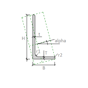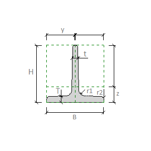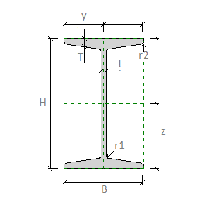 B. 幅: 断面形状の外側の幅です。 H. 高さ: 断面形状の外側の高さです。 T. フランジの厚さ: 断面形状のフランジの厚さ(外部サーフェス間の距離)です。 t. ウェブの厚さ:断面形状のウェブの厚さ(外部サーフェス間の距離)です。 r1. ウェブ フィレット: ウェブとフランジ間のフィレットの半径です。 r2. フランジ フィレット: 断面形状のフランジ端部のフィレットの半径です。 y. 水平方向の図心: 水平軸に沿った、断面形状の図心から左側端部までの距離です。 z. 垂直方向の図心: 垂直軸に沿った、断面形状の図心から下側端部までの距離です。 alpha. 主軸の角度: 主軸と断面の参照面との間の回転角です。これは、構造解析ファミリ パラメータとして一覧表示されます。 |