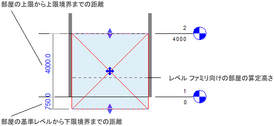 Revit LT では、部屋の上限および基準レベルから上下の境界までの距離を示すため、仮寸法が表示されます。必要に応じて、値を直接入力できます。「仮寸法値を使用する」を参照してください。