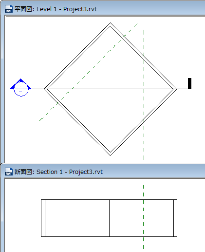 たとえば、次の平面図には、参照面が 2 つ、緑色の破線で表示されています。左側の参照面は切断線に斜めに交差しています。右側の参照面は切断線に垂直に交差しています。斜めの参照面は切断線に対して垂直ではないため、作成される断面図ビューに表示されません。一方、垂直な参照面は断面図ビューに表示されます。