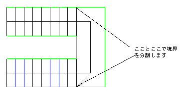 境界線と蹴上げ線をスケッチして作成する階段に踊り場が含まれるときは、境界線を踊り場に接する箇所で分割して、手すりが階段の勾配と踊り場に正確に合致するようにします。