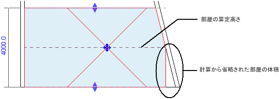 断面図ビューでは、部屋の境界のグラフィック表示は、容積の計算がオンかオフかによって異なります。(「部屋の容積の計算を有効にする」を参照してください)。