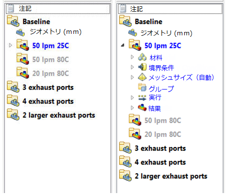 各デザインスタディには少なくとも1つのデザイン(特定のCADジオメトリ)が含まれ、各デザインには少なくとも1つのシナリオ(材料、境界条件、メッシュ設定と解析結果の集合)が含まれます。デザインは黒の太字で、シナリオは青の太字で表示されます。設定の割り当てと結果は、各シナリオ内に青の細字でリストされます。解析はこのウィンドウから管理します。