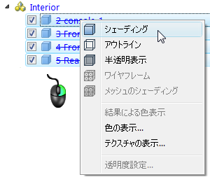 7. 車体をシェーディング表示するには、[解析結果] > [材料[ブランチの [Steel]ブランチの下で、[Car Body]部品の横にあるチェック ボックスをオンにします。選択した部品名を右クリックし、[シェーディング]を選択します。