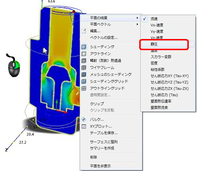 4. バルブの圧力損失を表示するには、平面を右クリックし、[平面の結果]から[静圧]をクリックします。