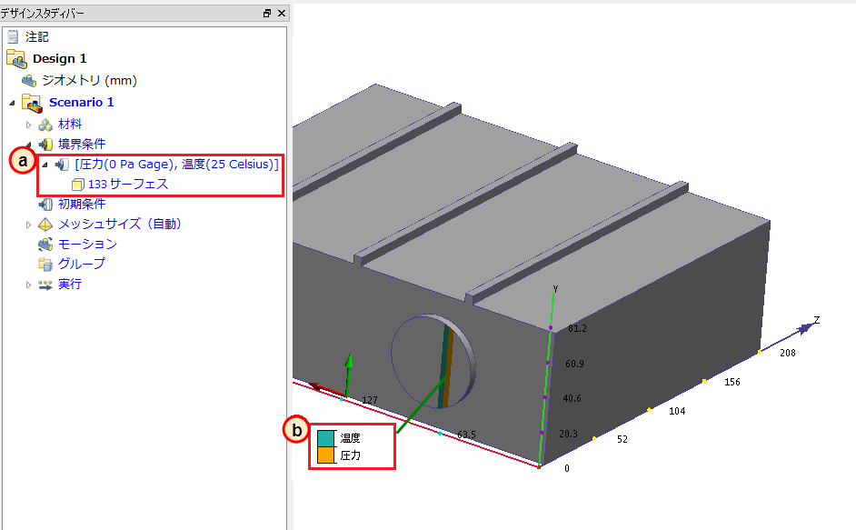 この手順では、周囲環境に露出する開口部として流入口の境界を定義します。これを行うには、周囲圧力と周囲温度の条件を適用します。