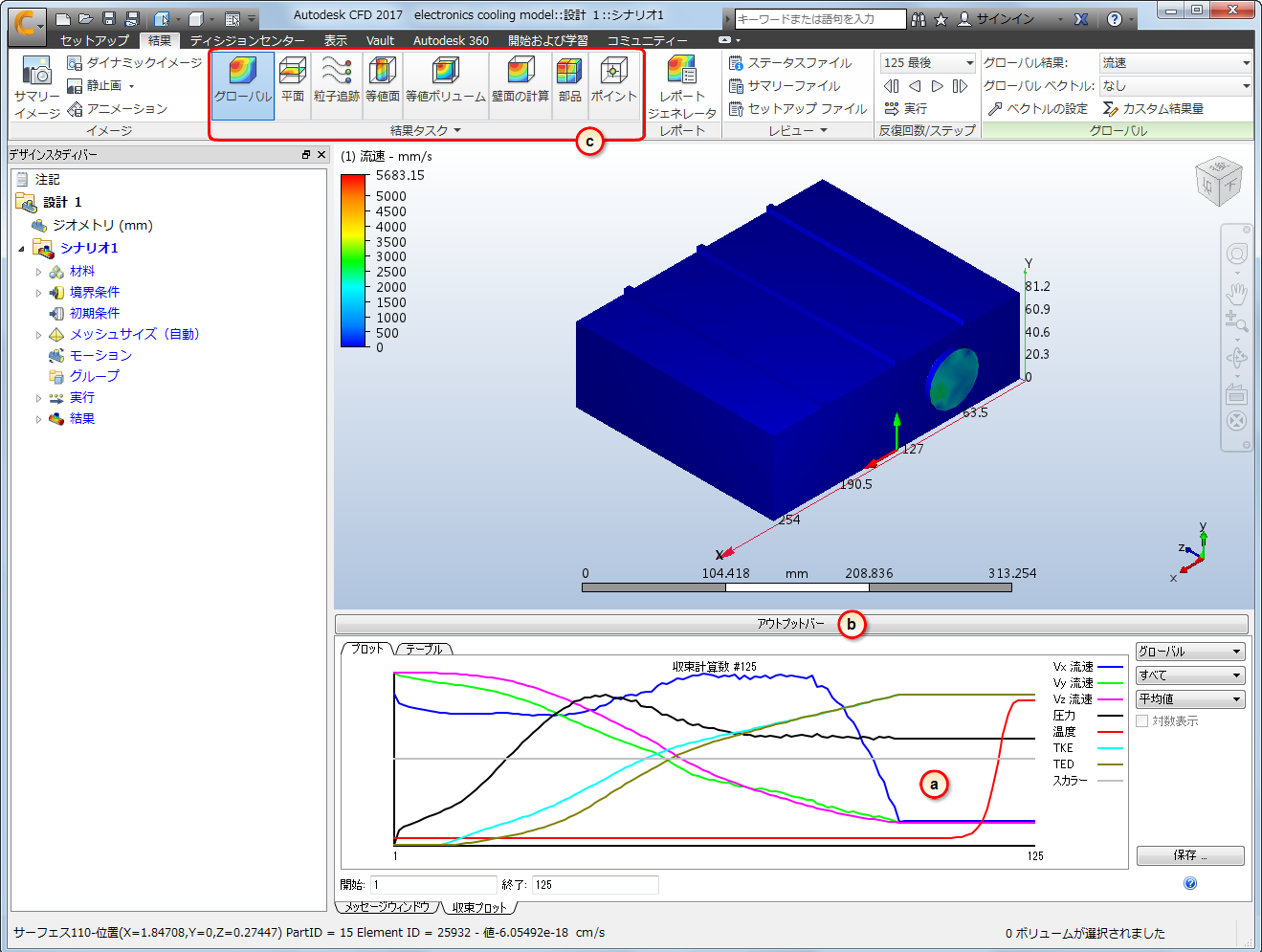- a. 収束プロットでは、シミュレーション中の計算の状態が表示されます。シミュレーションが完了し、解析がこれ以上変化しなくなると、線分がフラットになります。