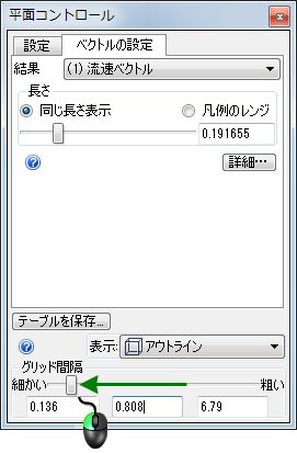 5. [平面コントロール]ダイアログの[グリッド間隔]スライダを[細かい]に向けてドラッグします。