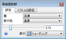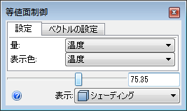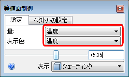 1. [等値面制御]ダイアログ ボックスで、[量]と[表示色]の両方を[温度]に変更します。