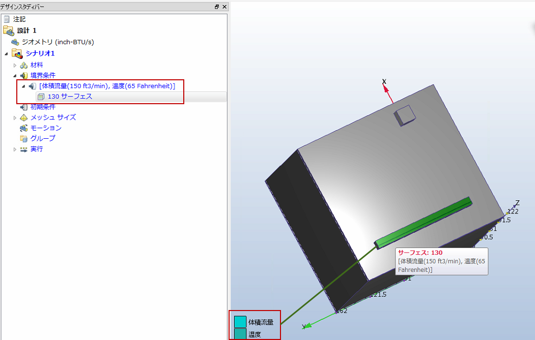 14. 2 つの境界条件が正しく割り当てられていることを確認するために、デザイン スタディ バーと、給気サーフェス上の色付きのストライプを調べます。