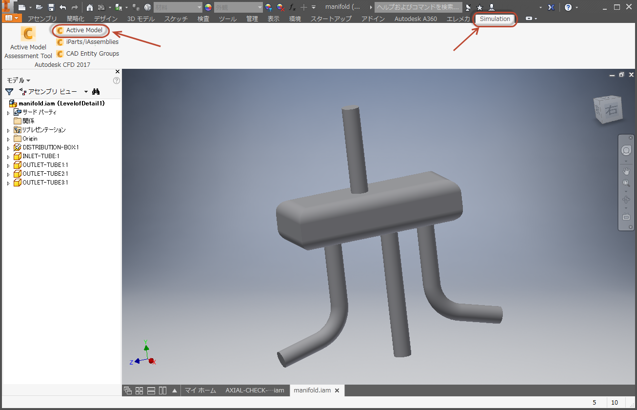 たとえば、Autodesk® Inventor から起動する場合は、[シミュレーション]と[アクティブ モデル]をクリックします。