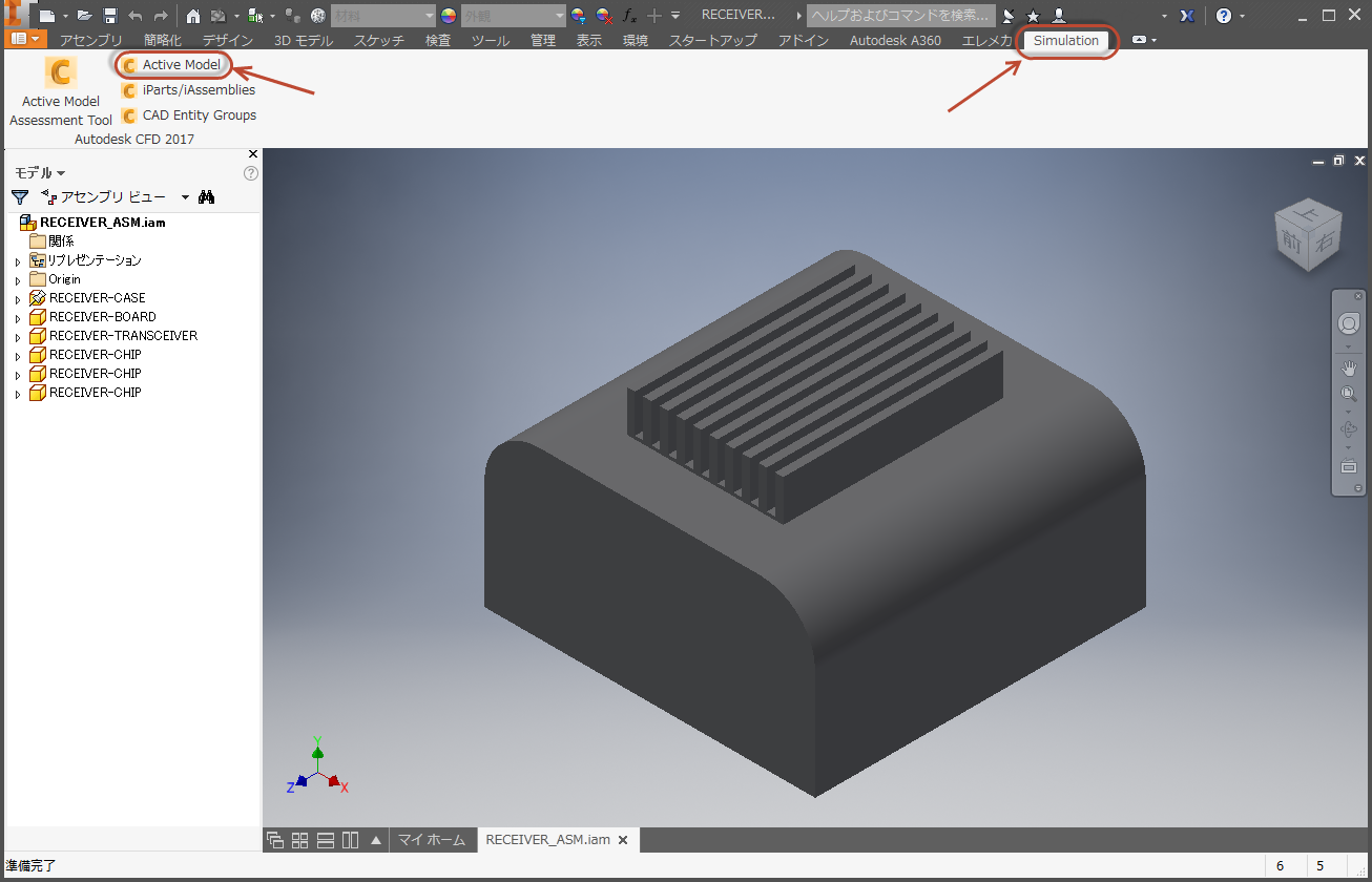 たとえば、Autodesk® Inventor から起動する場合は、[シミュレーション]と[アクティブ モデル]をクリックします。