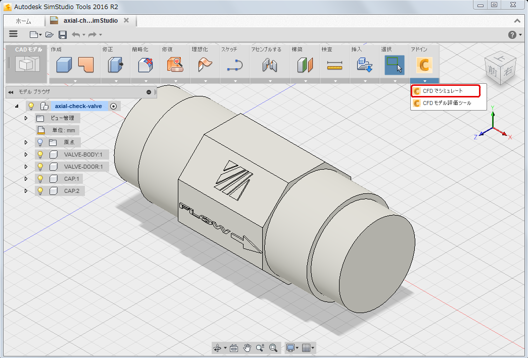[アドイン] メニューを展開して、[CFD でのシミュレート]を選択します。