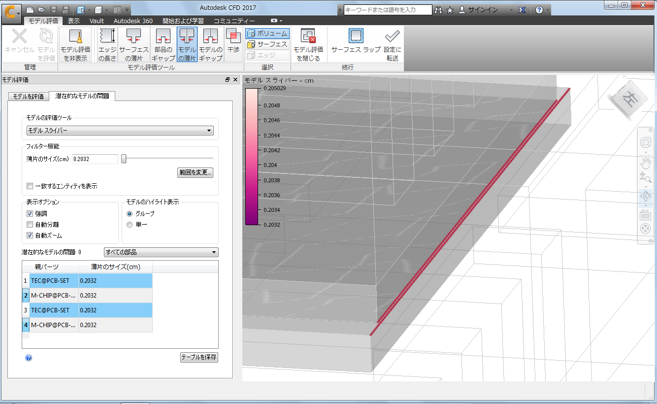 テーブル項目を選択し、[自動ズーム]と[強調]を選択すると、チップとヒート シンクのインタフェースに潜在的なスライバーの問題が表示されます。