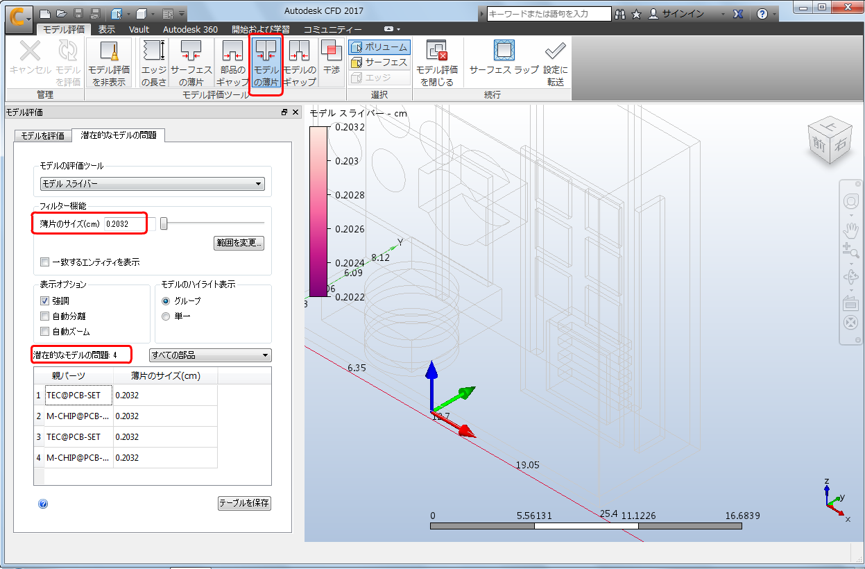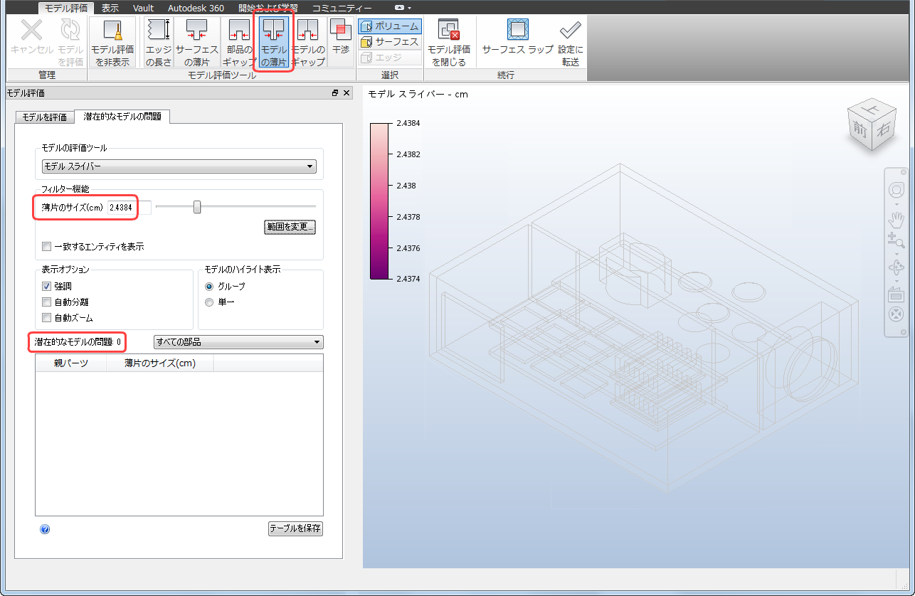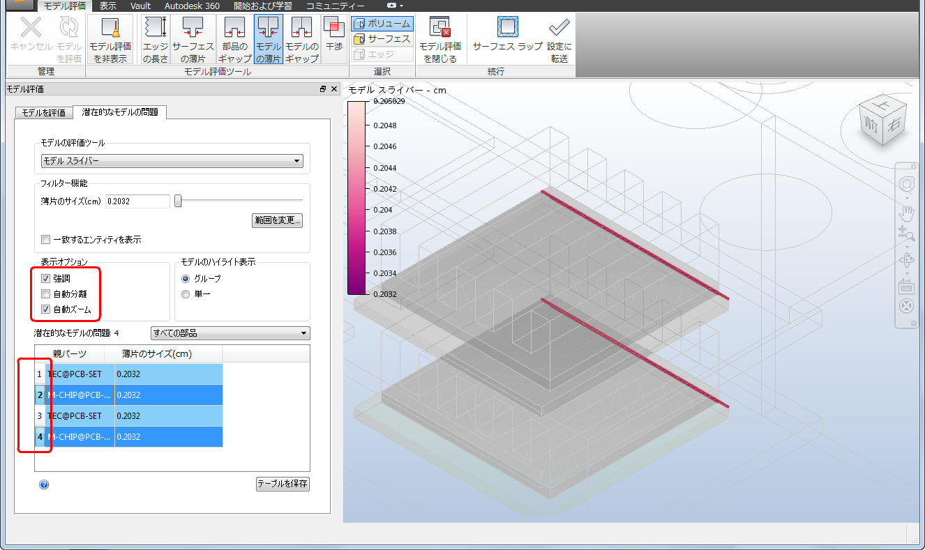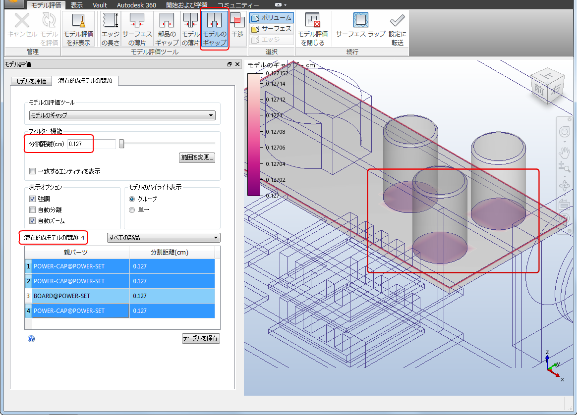 作成したモデルに戻って[モデルのギャップ]ツールを使用すると、初期フィルタのサイズ設定の既定値 0.127 mm によって、4 つの潜在的なギャップの問題が発生することがわかります。