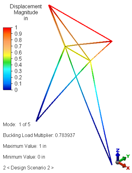 Important: The Buckling Load Multiplier of 0.784, for Mode 1 of 5, is shown in the annotation at the lower left corner of the screen. The significance of this result is that the beam tower theoretically will buckle at 78.4% of the applied load. Therefore, the tower will fail due to geometric instability, even though the stress levels determined by the prior static stress analysis are well below the yield strength of the AISI 4130 alloy steel material. This clearly demonstrates the necessity of checking critical buckling criteria for tall, slender structures that are subjected to compressive loads.