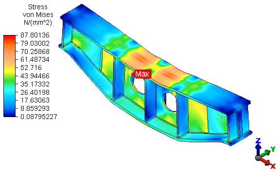 The maximum Von Mises stress is now approximately 88 N/mm2, which is below the allowable stress of 90 N/mm2. The stress results appear as shown in the following image.