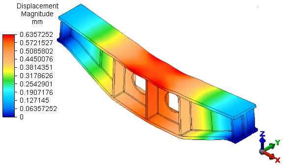 Run Simulation. After solid meshing, the analysis proceeds and the model displays in the Results environment. By default, the displacement magnitude is presented initially. The maximum displacement is approximately 0.64 mm, which exceeds the allowable displacement of 0.5 mm.