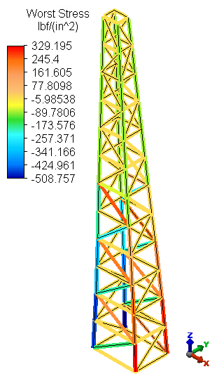 Note: Since trusses only support axial loads, the Axial Stress (Local 1 Direction) and Worst Stress results are identical. There are no bending stress components.
