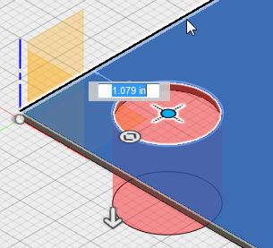3. Click the long edge of the top surface of the board (the one nearest to the bottom left corner of the screen). A dimension field appears allowing you to specify the distance from this edge to the center of the hole.