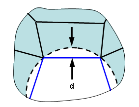(b)穴周辺のメッシュが、真のサーフェスからある程度の距離 d で偏差します(パーツのフィーチャ上のラインは青色で、理論上の穴は破線の円で示されます)。指定したメッシュ サイズなどのパラメータを使用した偏差がオプションで許可されているものより大きくなる場合は、フィーチャに沿ってメッシュ サイズが小さくされることによって偏差が小さくなります。