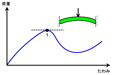 図 1: 力-変形曲線に対する接線が水平(点 1)な状況でスナップ スルーが静的に不安定になる。