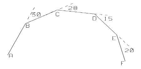 下図は、曲線角度の視覚的な説明です。開始セグメントと現在のセグメントとの間の角度が曲線角度よりも大きい場合は、新しい開始セグメントが作成され、そのセグメントの開始点がメッシュされたモデルの節点になります。フィーチャ曲線上のポイントに A、B、C、D、E、F と名前を付けるとすると、各セグメント間の角度は次のようになります。