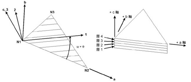 図 3: 3 角形要素におけるローカル要素軸 a-b-c、レイヤ軸 1-2-3、およびレイヤの番号付けの例