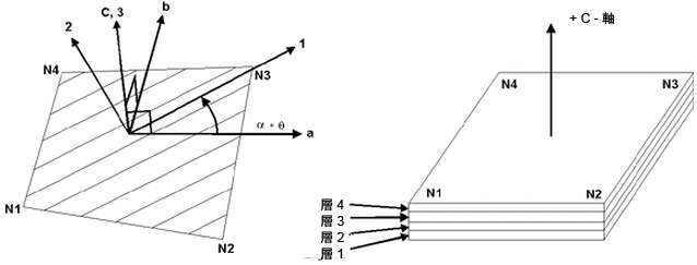 レイヤ 1-軸は、各レイヤの繊維に沿った軸です。レイヤ 2-軸は、各レイヤの繊維に対して垂直な軸で、要素の面にあたります。レイヤ 3 軸は、要素に対して垂直であり、またそのためにローカル要素軸 c に対して平行となります。