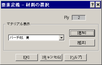 [要素定義]の[複合材の積層順序]表で[材料]列をクリックすると、 図 1 に示す[材料選択]ダイアログが表示されます。ドロップダウンには、モデルのパーツの薄板(層)に対して使用されている複合素材がすべて一覧表示されます。既存の材料を選択して、[OK]ボタンをクリックすると、選択した材料を現在の薄板に適用できます。