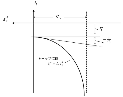 さまざまなキャップ関数係数の物理的な意味を図 3 に示します。この図から、係数 C1 は材料が達する可能性のある最大塑性体積ひずみを表しており、C2 はキャップ位置の増分率の測定結果を示していることが分かります。