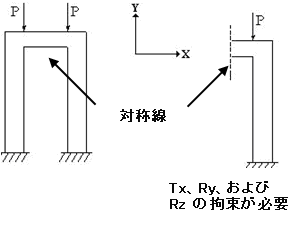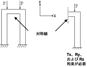 ジオメトリ、荷重、および結果が平面について対称であるとき、モデルには対称性があります。モデルに対称性がある場合、モデルの半分(片側の部分)のみをモデリングするだけで済みます。対称モデルで作業する際は、対称の平面に沿って適切な境界条件を適用します。次の図に示すように、面外移動および 2 つの面内回転を拘束します。境界条件を適用する場合、全体平面に沿って対称境界条件を自動的に適用する 3 つのボタンがあります。これらのボタンは、対称平面に垂直なベクトルを基準にしています。たとえば、[X 対称]ボタンをクリックすると、YZ 平面に沿って対称境界条件が適用されます。