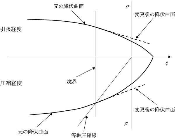 張力と圧縮が混在する領域では(参考 1)、降伏曲面が境界の元のサーフェスに対して正接面となるよう変更されます。