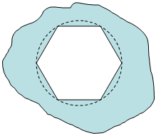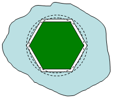 穴の中のシャフトやピンなど、密集した移動パーツの場合は特別な配慮が必要です。数学的には、パーツ間のギャップは物理的なギャップより小さくすることができます。数学的なギャップは、メッシュのサイズとサーフェスの近似により決定します。物理的なギャップは、パーツの寸法に基づきます。近似された表面が移動または回転すると、現実には存在しないような干渉も起こりえます。(図 3 を参照)。