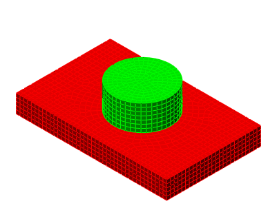 一部の CAD プログラムでは面またはサーフェスをさらに小さい領域に分割する機能を備えていますが、分割面を作成する代替方法として表面分割を使用できます。(面を分割する機能を備えていない CAD パッケージの場合、Autodesk Simulation Mechanical の表面分割が唯一の実用的方法となります)。モデリングしているパーツを円形の補助パーツに溶接し、この補助パーツは解析で必要ない状況を想定します。ただし、円形の補助パーツのパターンは、境界条件を適用するためにモデルのメッシュで必要であるとします。表面分割機能を使用する場合のこの作成方法を次に示します。