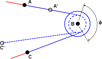 滑車(青)は、ドライバ(点 A)、支点(点 B)、緩み(点 C)、および滑車半径(下を参照)で定義します。トラス要素など、滑車に接続されるその他の要素は赤で示されています。点 A が A' に移動すると、点 C は対応する距離だけ点 C' に移動します。回転角度(図に示す φ)は、ソフトウェアによって決定され、解析中に変更されることがあります。